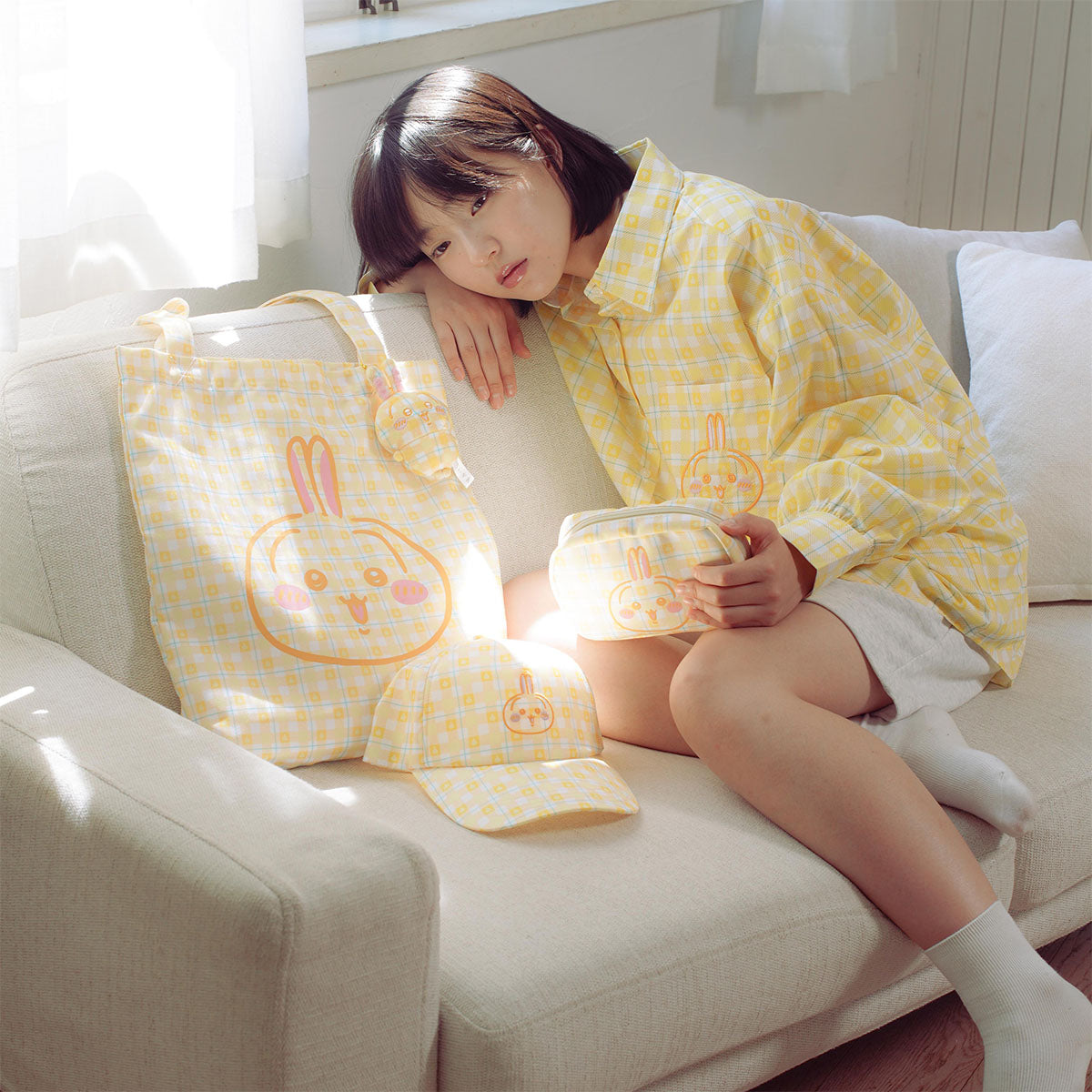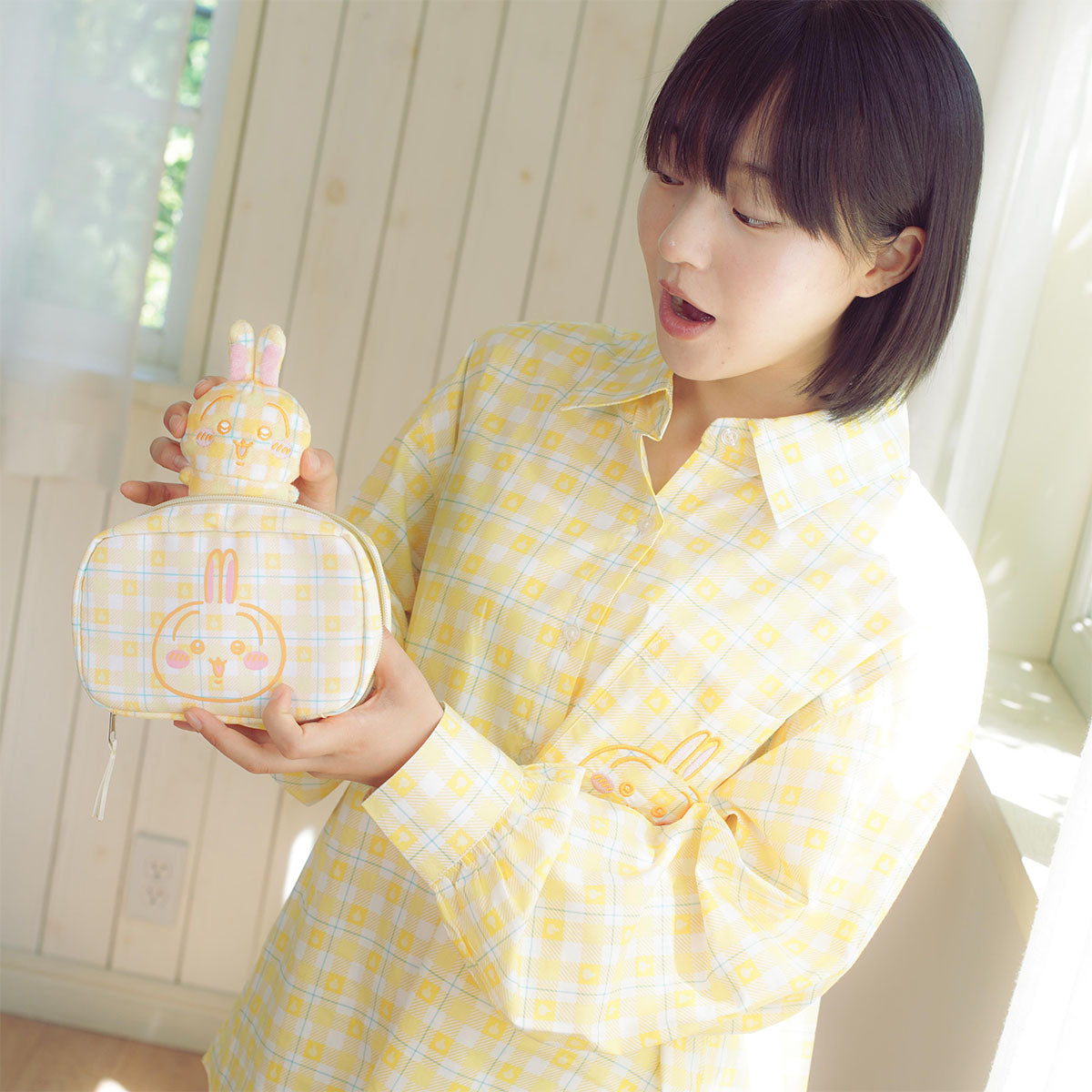 イエローチェックにうさぎのお顔がにっこり。