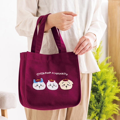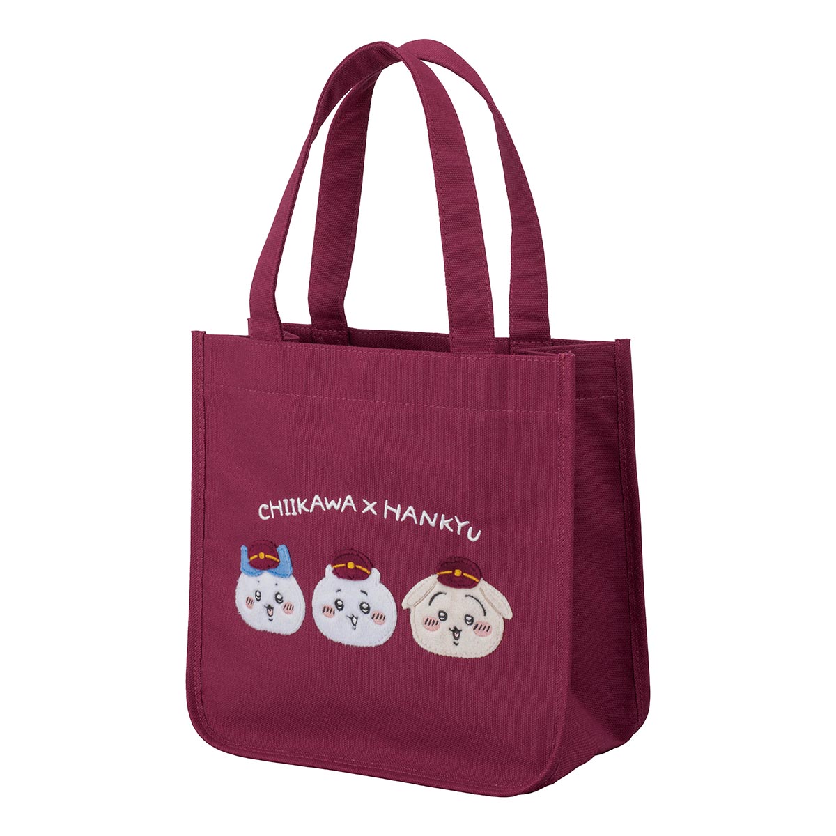 阪急電車をイメージしたマルーンカラーのバッグに、制帽を被ったちいかわたちがデザインされたスクエア型ミニトートバッグ。