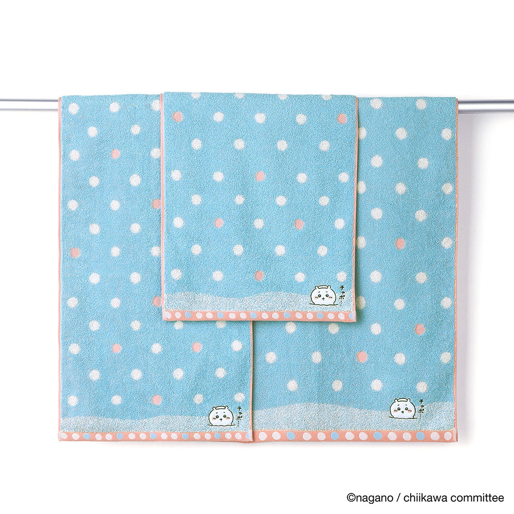 お風呂に入っている『ちいかわ』のアップリケと水玉柄がマッチした、ほのぼのデザインのタオルです。