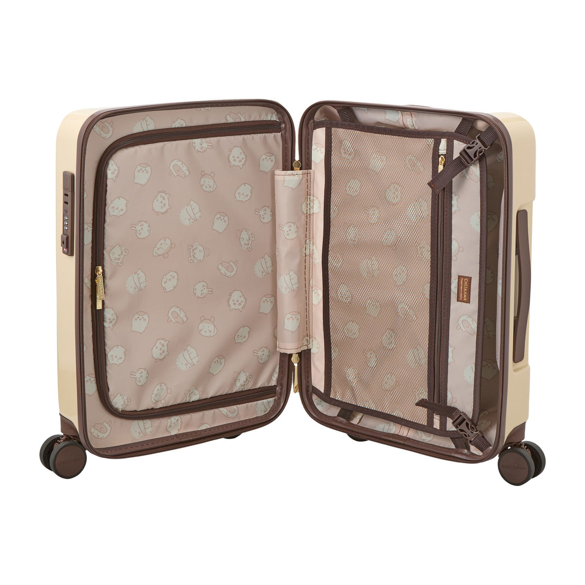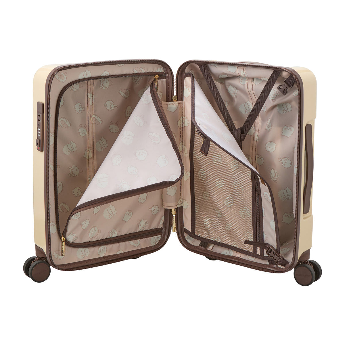 ちいかわたちが正面にプリントされたスーツケース。キャスターは『ダブルキャスター』なので凹凸の多い路面でも安定した走行が可能。更に衝撃吸収『サスペンションキャスター』なので振動が手に伝わりにくく疲れにくい。