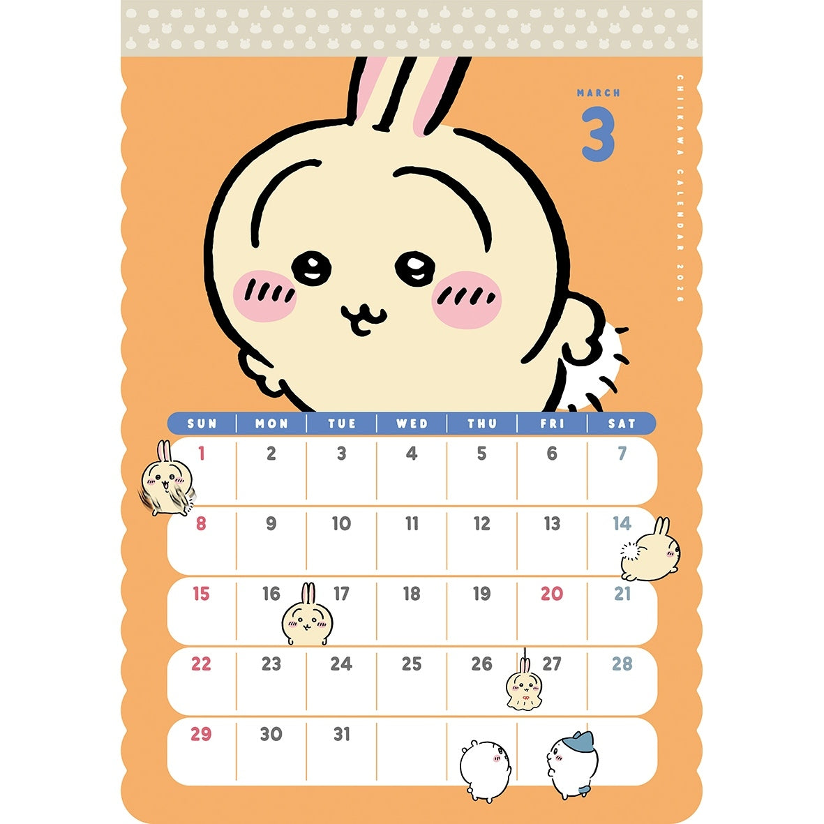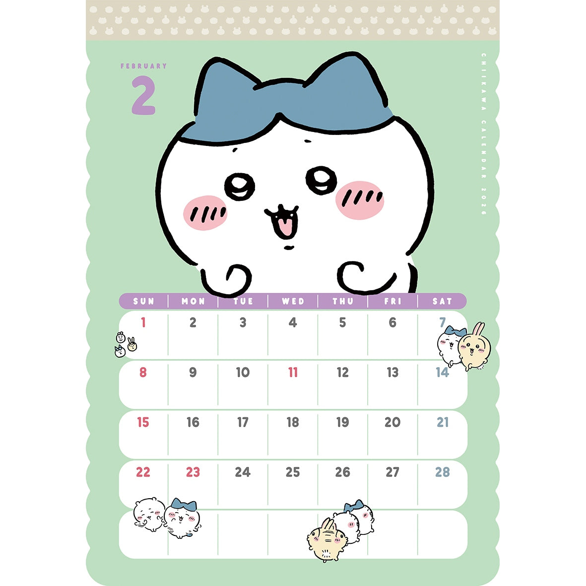 ちいかわの2026年版壁掛けカレンダー。各月のメインを飾るのは、ちいかわ・ハチワレ・うさぎをはじめ、個性豊かな仲間たちの愛らしいビッグフェイス!周りはキュートなフリフリの型抜きです。
