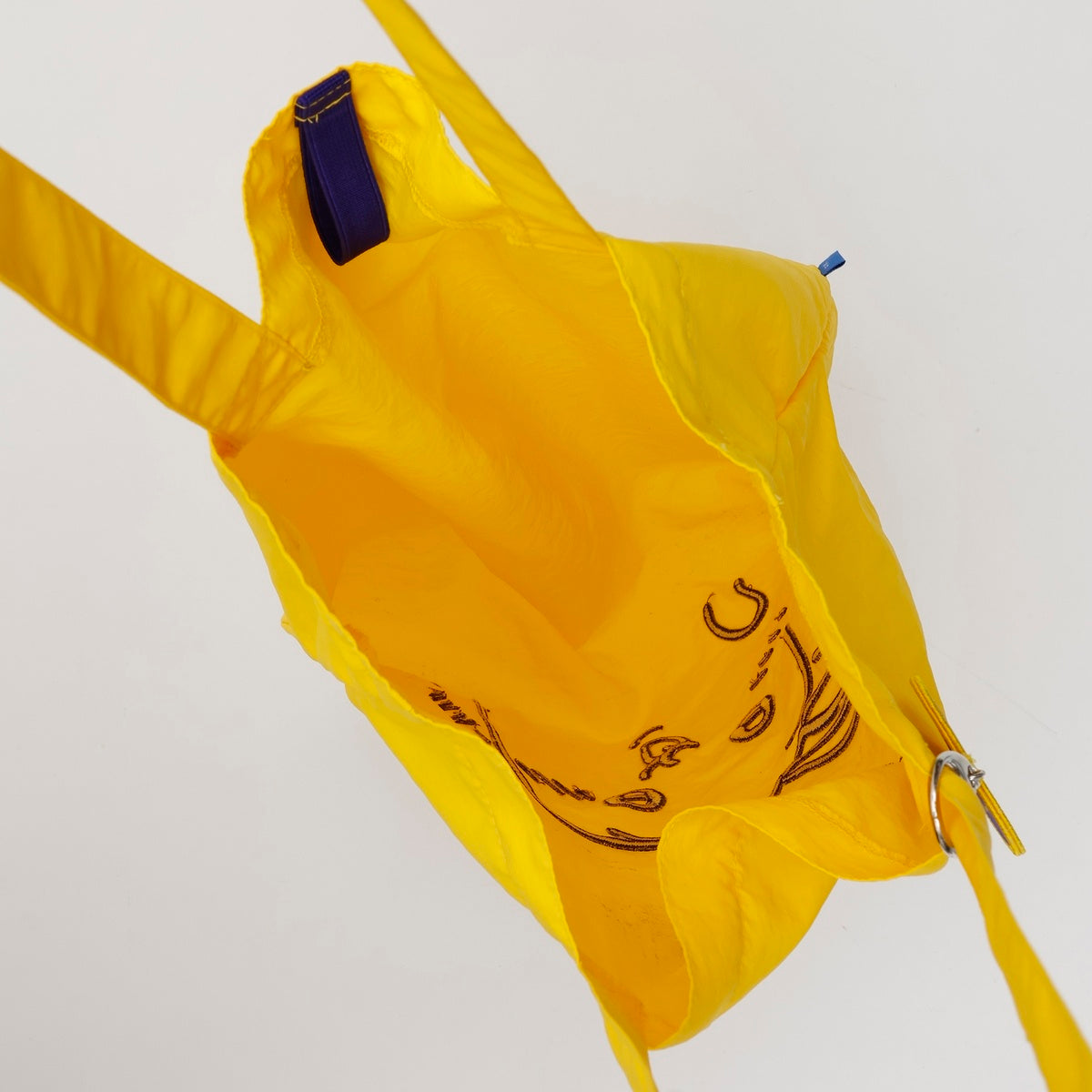 The tote bag with a large embroidery on a vivid nylon is here! The handle is a good length for easy shoulder carrying!