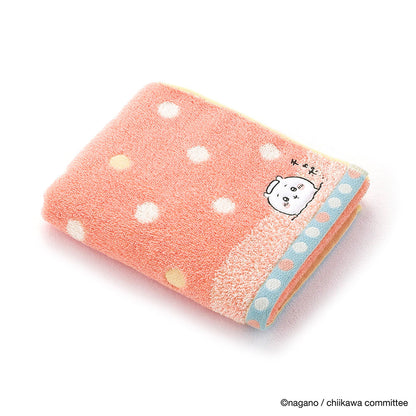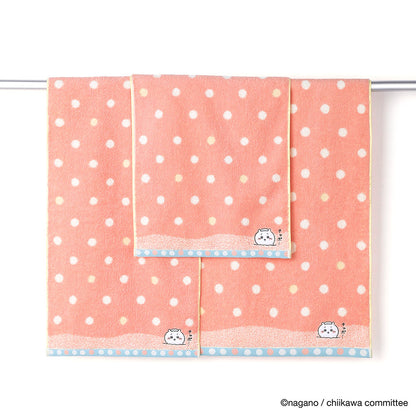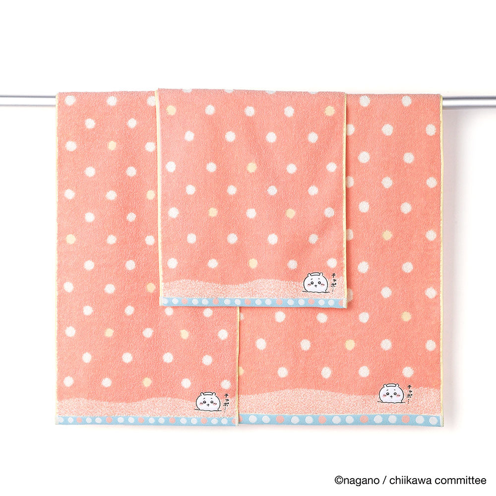 목욕 중인 『치이카와』의 애플리케와 물방울 무늬가 매치된, 소박한 디자인의 타올입니다.