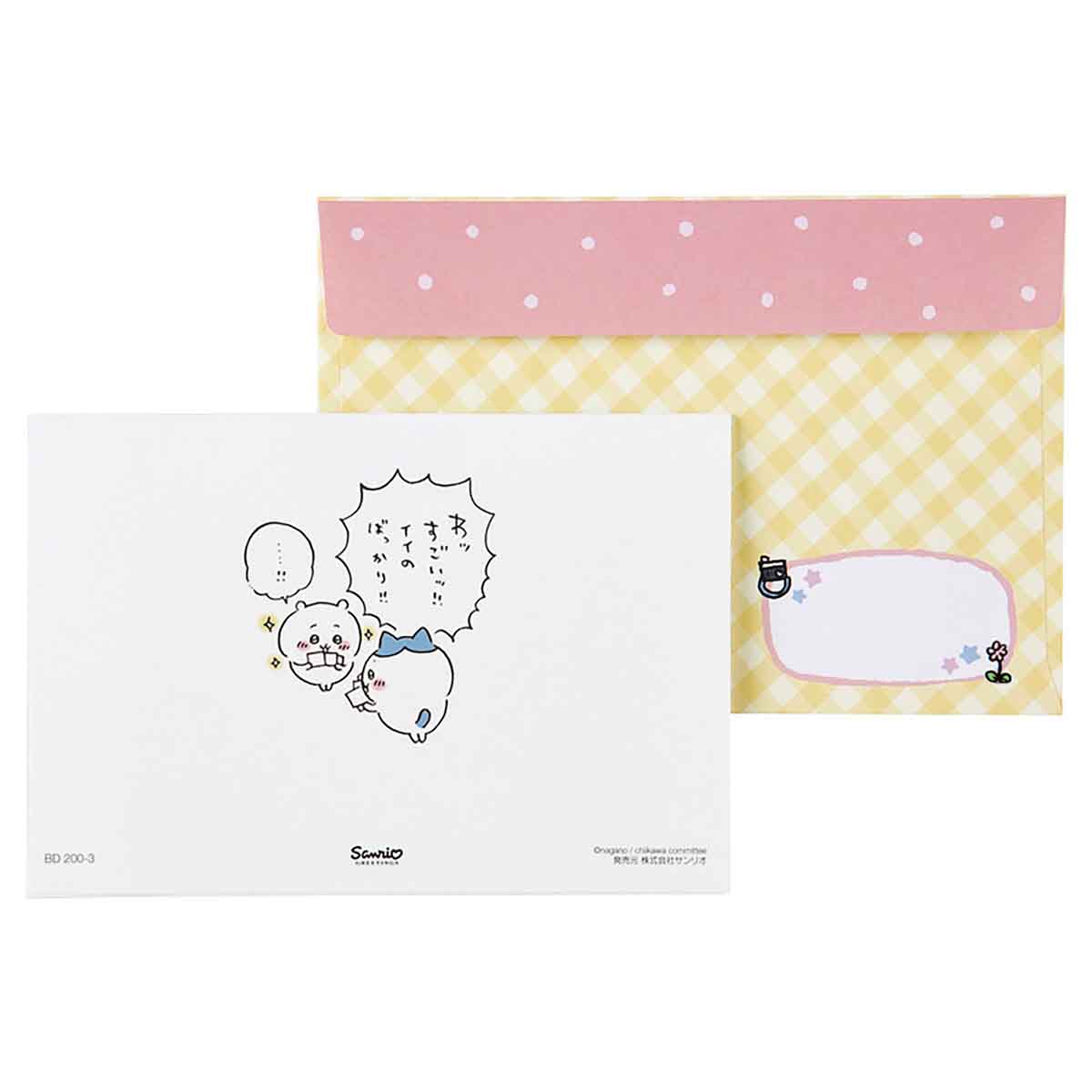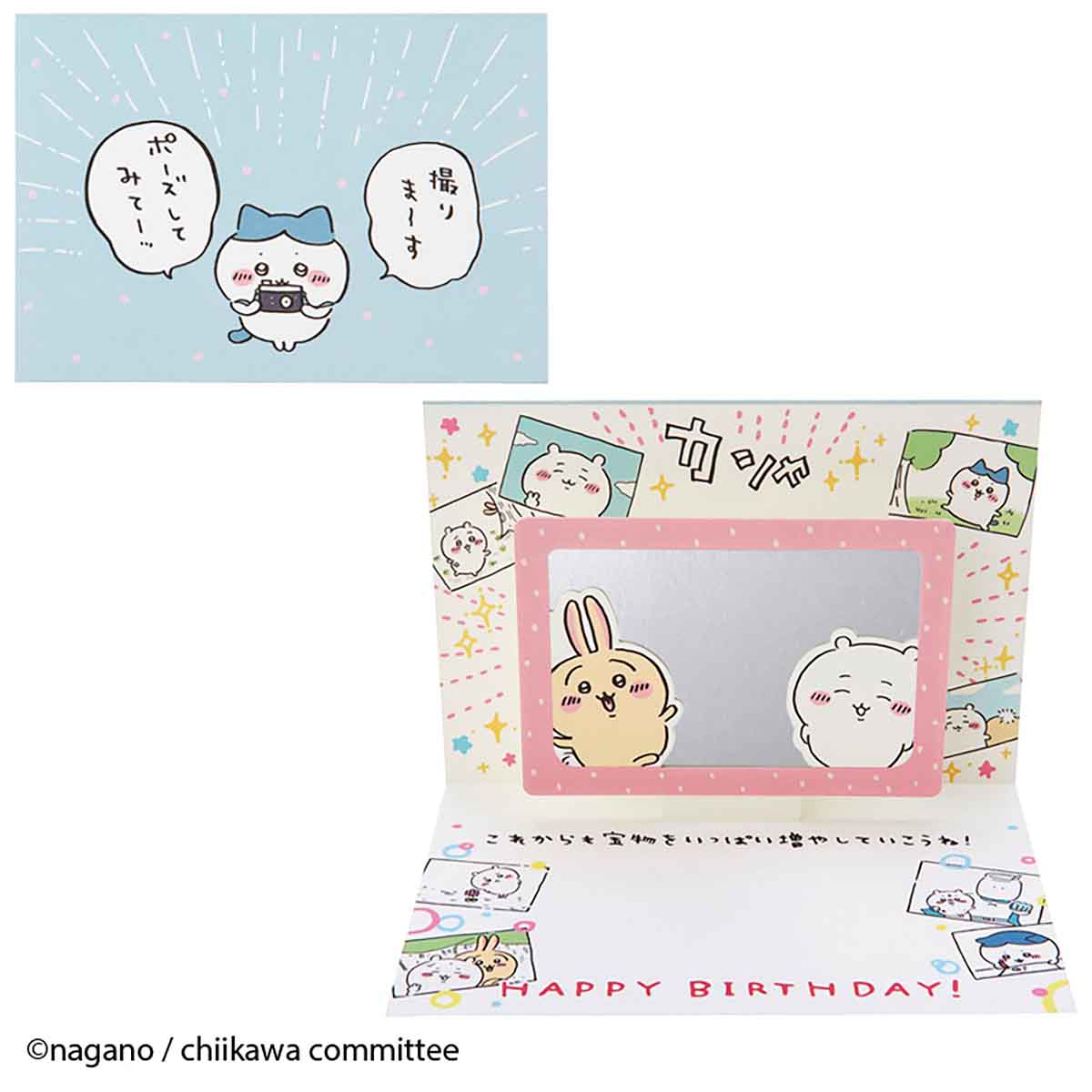 카드를 열면, 거울 소재에 카드를 든 사람의 얼굴이 비치고, 치이카와・우사기와 함께 사진을 찍은 기분을 맛볼 수 있습니다.