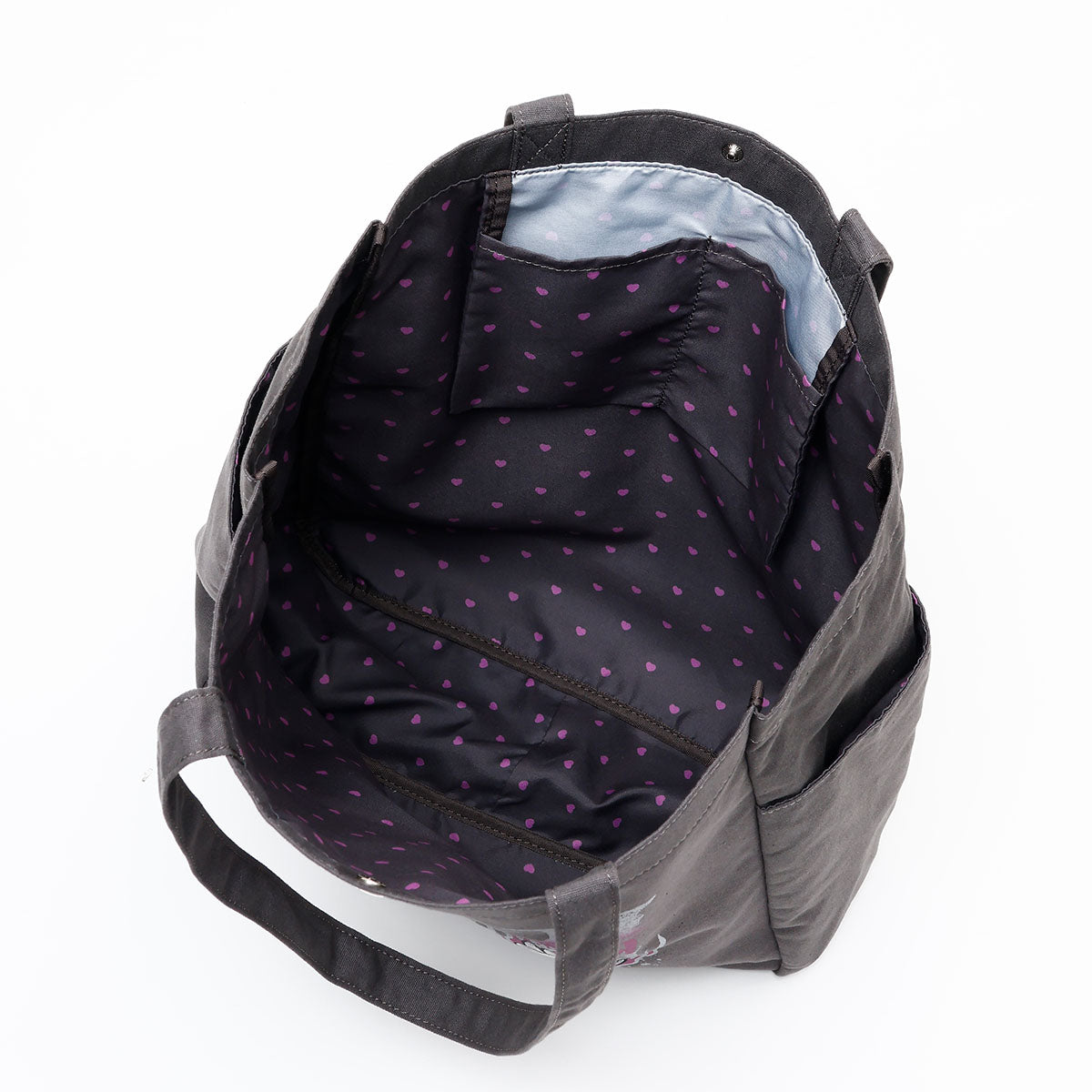 양쪽 사이드와 내부, 뒷면에도 포켓이 있어서 여러 가지를 넣을 수 있는 토트가방입니다. 내부 생지의 하트 무늬도 귀여워요!