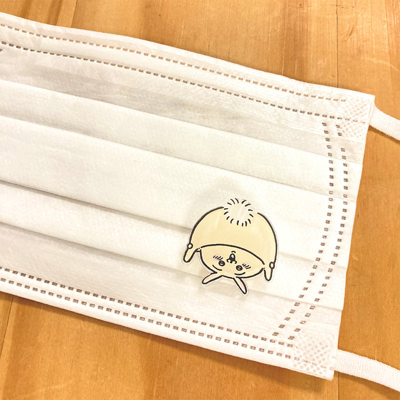 はさんでつけるから穴が開かない「マスクチャーム」です。