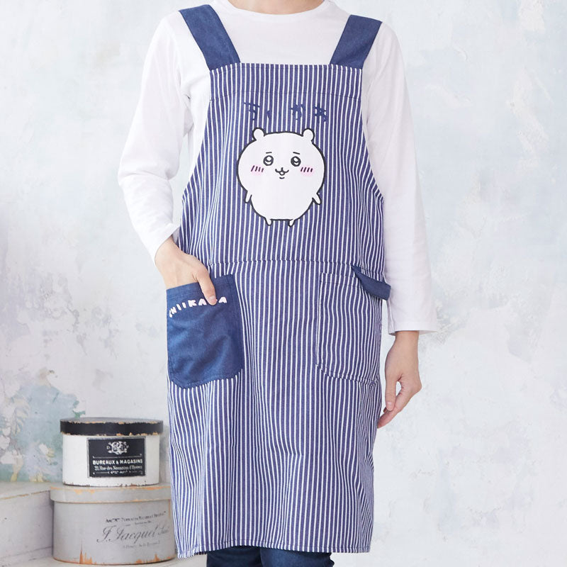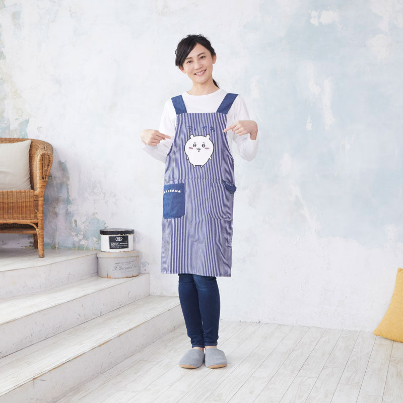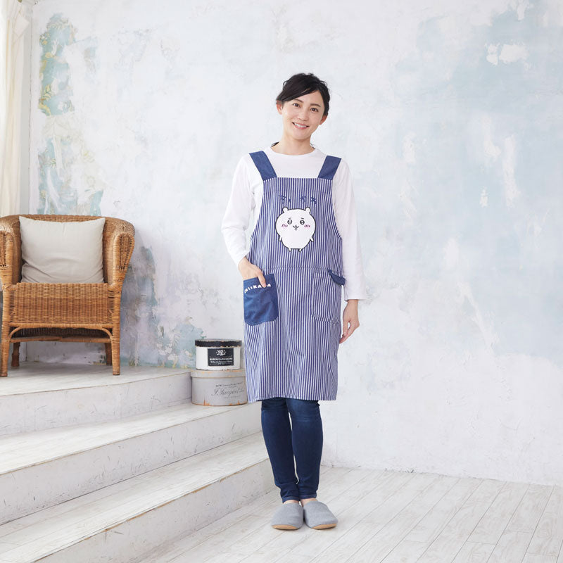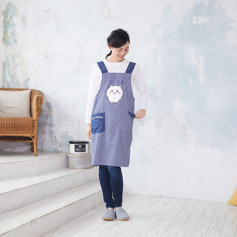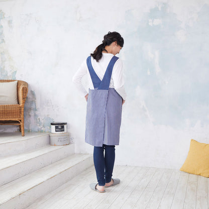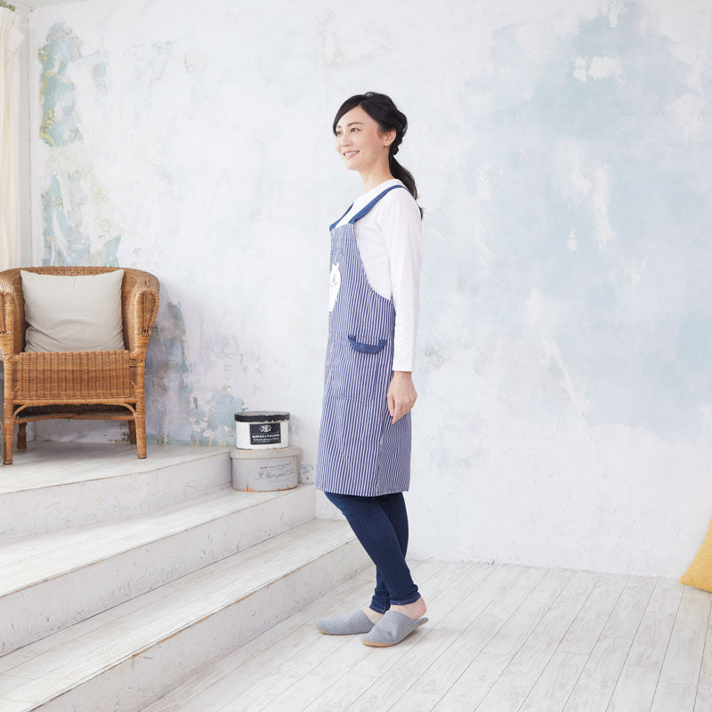 すっきり見えのストライプ柄で被るだけのラクチンエプロンです。