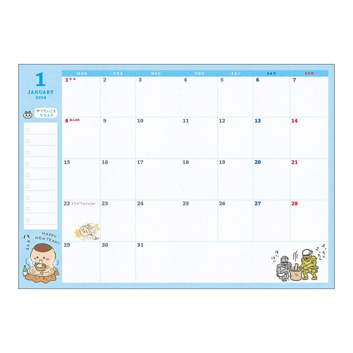 ちいかわのスケジュール帳が今年も登場!! たっぷり書き込めるB6サイズ! 1ヵ月の予定がひとめでわかる見開きマンスリータイプ(月曜始まり)のスケジュール帳です! メモページはノート感覚で使用できる「有罫メモ」と「ふきだしメモ」の2種類です。